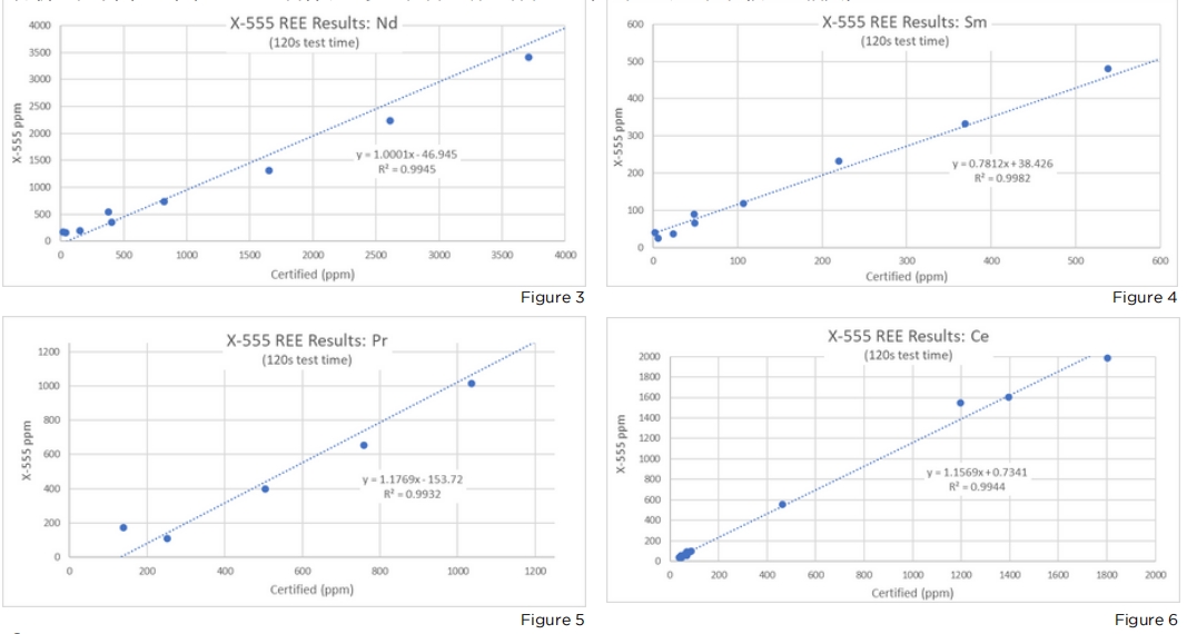 X-555具有特殊的屏蔽能力和3mm直徑的光束準(zhǔn)直性,可直接用于巖石表面和巖芯。它還可以配備一個聯(lián)鎖試驗臺,用于袋裝或袋裝樣品的安全分析。在下圖3-6中,X-555對各種認(rèn)證參考材料的研究結(jié)果顯示,它們與認(rèn)證值有很好的相關(guān)性。