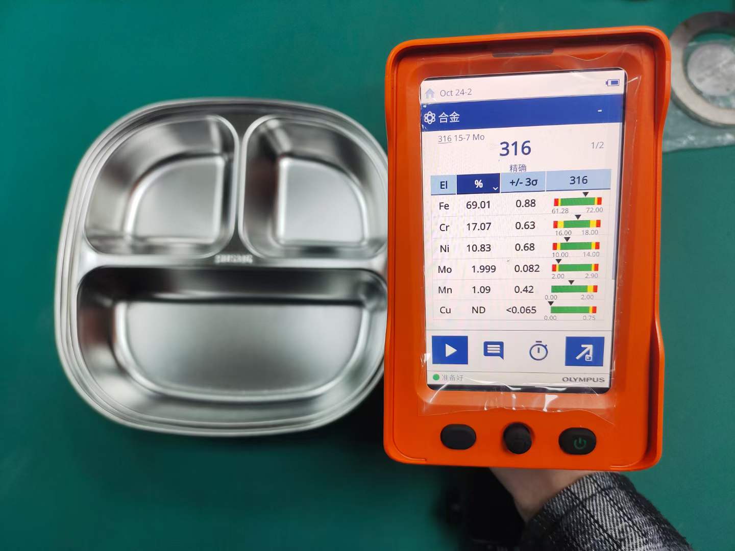 圖為奧林巴斯手持光譜儀檢測(cè)出合格的316、304不銹鋼餐具