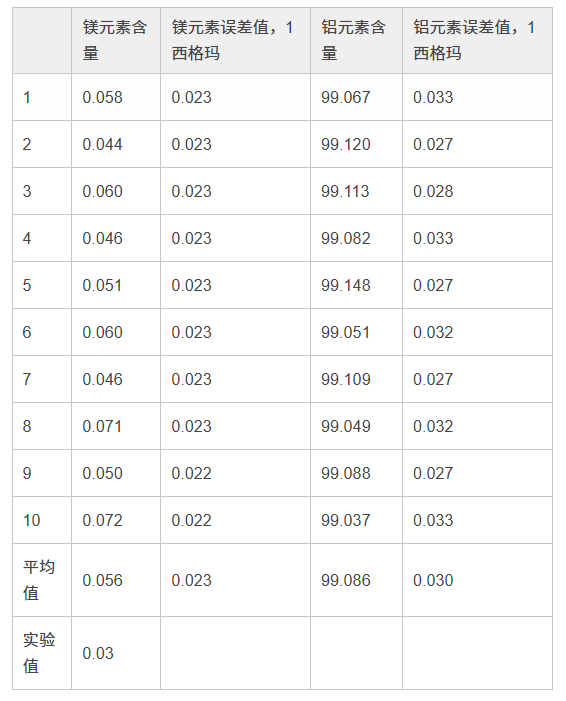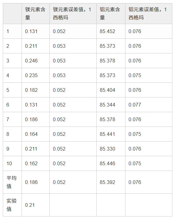 在檢測牌號為1100的鋁合金時,使用40 kV光束進行3秒鐘檢測,以及使用13 kV光束進行60秒鐘檢測,所得到的結果。