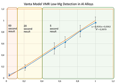 大多數鋁合金牌號中的鎂元素含量都等于或大于0.4%。因此,使用低能量光束進行檢測,只需5秒鐘時間,就可以根據所測到的鎂元素含量水平,準確地對大多數鋁合金進行分揀(總共需要6秒鐘)。這些結果表明只需進行相對較短時間的檢測,就可以準確地辨別含有少量鎂元素的不同牌號的鋁合金。