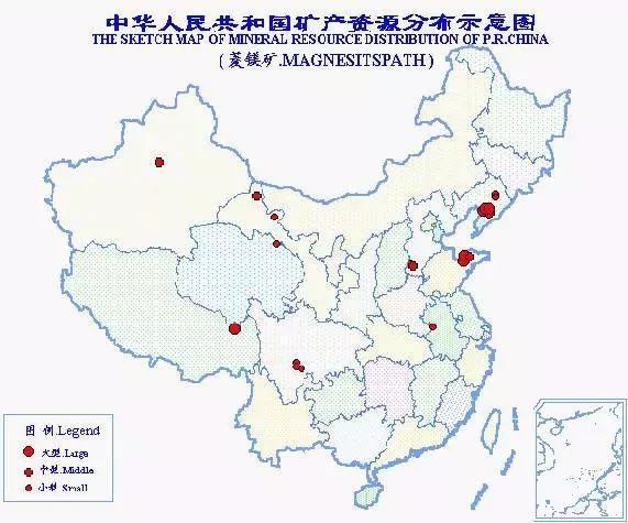 中國是世界上菱鎂礦資源最為豐富的國家??偙S袃α康V石30億噸,居世界第1位。我國菱鎂礦的重要特點是地區分布不廣、儲量相對集中,大型礦床多。探明儲量的礦區27處,分布于9個?。▍^),以遼寧菱鎂礦儲量最為豐富,占全國的85.6%。
