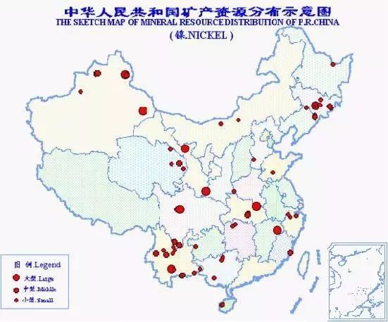 中國鎳礦資源不能滿足需要??偙S袃α挎?84萬噸,居世界第9位。鎳礦產地有近100處,分布于18個?。▍^)。