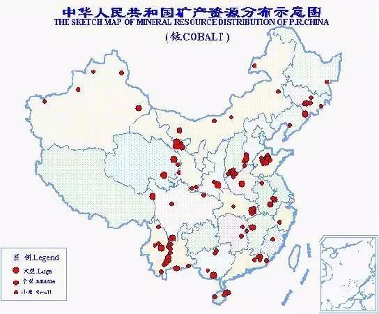 中國鈷礦資源不多,獨立鈷礦床尤少,主要作為伴生礦產與鐵、鎳、銅等其他礦產一道產出。已知鈷礦產地150處,分布于24個?。▍^),以甘肅省儲量最多,約占全國總儲量的30%。全國總保有儲量鈷47萬噸。