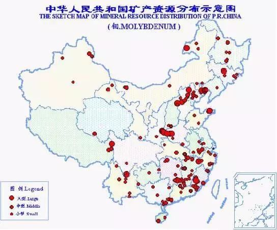 中國鉬礦資源豐富,總保有儲量鉬840萬噸,居世界第2位。探明儲量的礦區有222處,分布于28個?。▍^、市)。以河南省鉬礦資源為最豐富,鉬儲量占全國總儲量的30.1%。