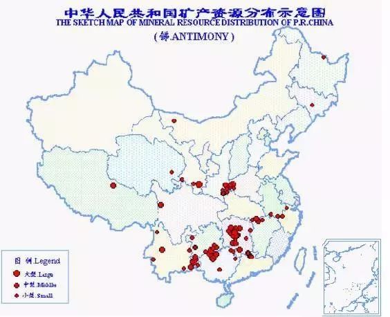 中國是世界上銻礦資源最為豐富的國家。總保有儲量銻278萬噸,居世界第1位。已探明儲量的礦區有111處,分布于全國18個?。▍^),以廣西銻儲量為最多,約占全國的41.3%;其次為湖南、云南、貴州、甘肅、廣東等省。
