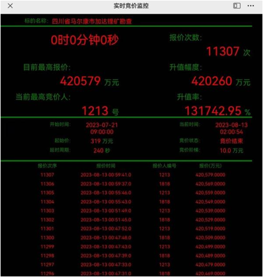值得注意的是,三天前(8月11日),四川能投資本控股有限公司以10.1億元的價格拍得四川省金川縣李家溝北鋰礦探礦權。該筆競價交易同樣鏖戰2天,報價次數3412次,較57萬元起拍價升值超1771倍。