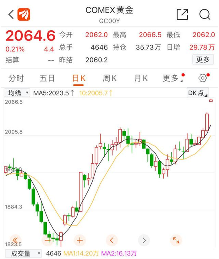繼上周五國際金價(jià)突破2000美元關(guān)口后,11月29日紐約商品交易所COMEX12月黃金期貨持續(xù)收漲,截止29日八點(diǎn),該指數(shù)暫報(bào)2064.7美元,連漲四日且創(chuàng)5月中旬以來的半年新高,也越來越逼近2080美元的歷史最高。