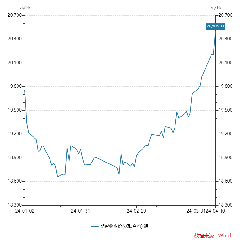 同樣一路“高歌猛進”的還有鋁價,截至4月10日下午收盤,滬鋁主連報20505元/噸,較上個交易日上漲1.38%,較年初上漲750元/噸,創下自2022年7月以來的價格新高。而LME鋁在4月8日收盤報2459美元/噸,較前一交易日上漲0.33%。