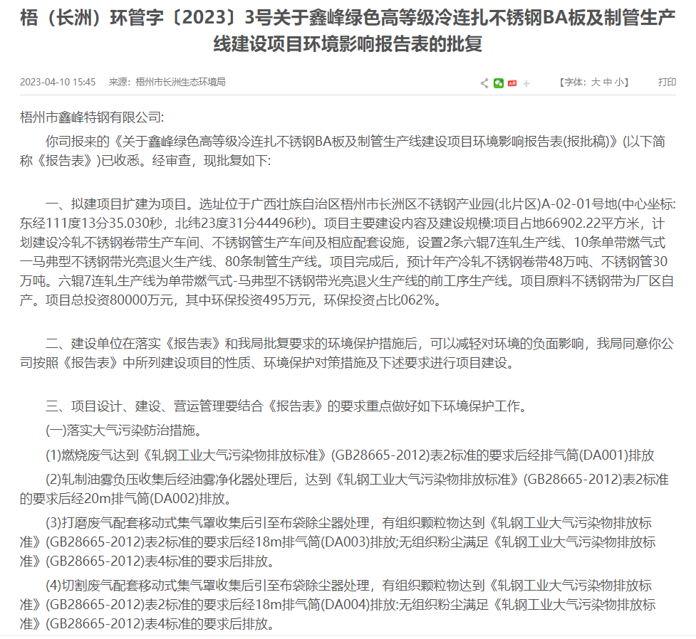 梧州市長洲生態環境局就鑫峰綠色高等級冷連扎不銹鋼BA板及制管生產線建設項目環境影響報告表作出批復意見。