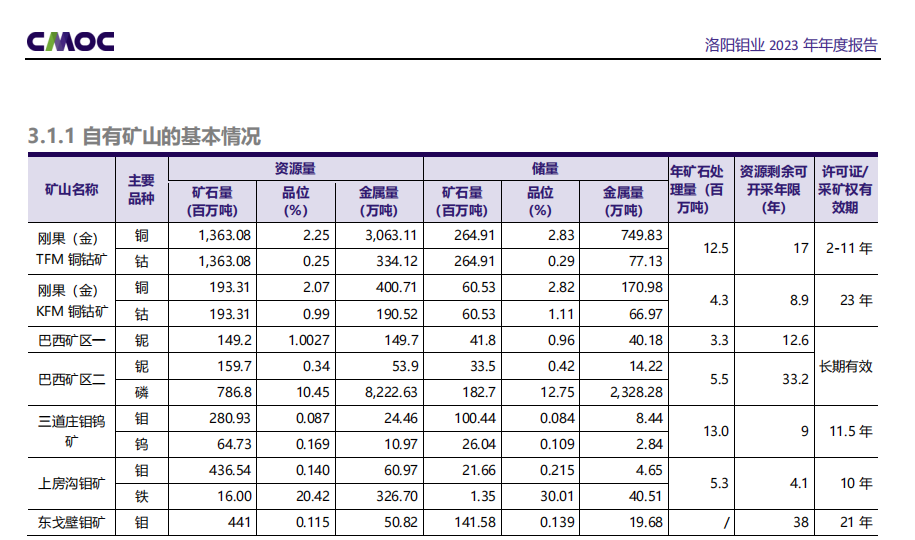 根據(jù)洛陽鉬業(yè)2023年年報,公司擁有多個優(yōu)質(zhì)礦山資源。其中,國內(nèi)三座,分別是上房溝鉬礦、三道莊鉬礦和東戈壁鉬礦。此外,公司在海外還有四座礦山。除了剛果(金)的TFM和KFM兩座礦山外,還有巴西的鈮礦和磷礦。其中,TFM是全球最大的銅鈷礦之一,KFM是全球第一大鈷礦,巴西鈮礦是世界第二大鈮礦。