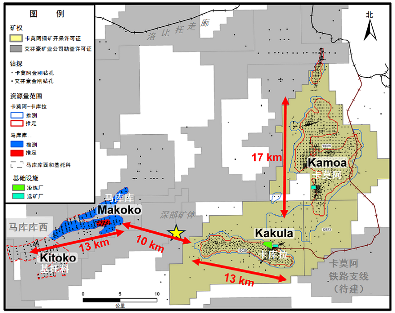 沿走向長(zhǎng)度可以同卡庫(kù)拉礦體相比,而卡庫(kù)拉銅礦床是卡莫阿(Kamoa)-卡庫(kù)拉(Kakula)聯(lián)合礦第1和第2階段精礦廠的銅礦石來(lái)源。卡庫(kù)拉銅礦床西緣距離馬庫(kù)庫(kù)礦床東緣大約10公里。