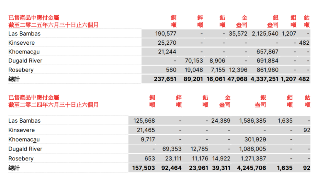 科馬考Khoemacau銅礦位于非洲南部卡拉哈里銅礦帶,保有銅資源量超640萬噸,銀資源量63億盎司。2021年投產(chǎn),設(shè)計年產(chǎn)銅6萬噸,銀160萬盎司。2024年3月被五礦資源收購。今年上半年該礦銅產(chǎn)量為2.12萬噸,同比增長121%,主要原因為今年生產(chǎn)天數(shù)長并且第二季度采礦量增加,2025年Khoemacau銅指導(dǎo)產(chǎn)量在4.3至5.3萬噸之間。