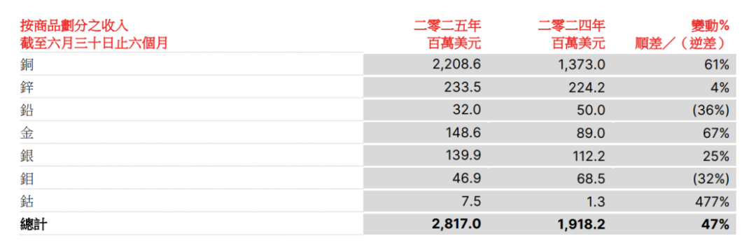 2025年上半年,倫敦金屬交易所(LME)金、銀、鈷等金屬價格分別上漲39%、26%、7%,也帶動五礦資源相關(guān)板塊營收的增長。當(dāng)然,五礦資源業(yè)績的“爆發(fā)”主要得益于銅板塊的量價齊升!
