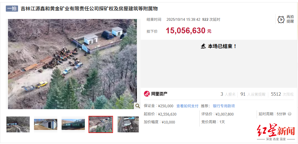 紅星資本局近日消息,吉林江源鑫和黃金礦業(yè)有限責(zé)任公司探礦權(quán)及房屋建筑等附屬物在阿里資產(chǎn)拍賣平臺被拍賣,本次拍賣經(jīng)過931輪出價(jià)(包括922次延時(shí)出價(jià)),最終以1505.663萬元的價(jià)格成交,對比起拍價(jià)255.663萬元,溢價(jià)1250萬元,溢價(jià)率達(dá)489%。