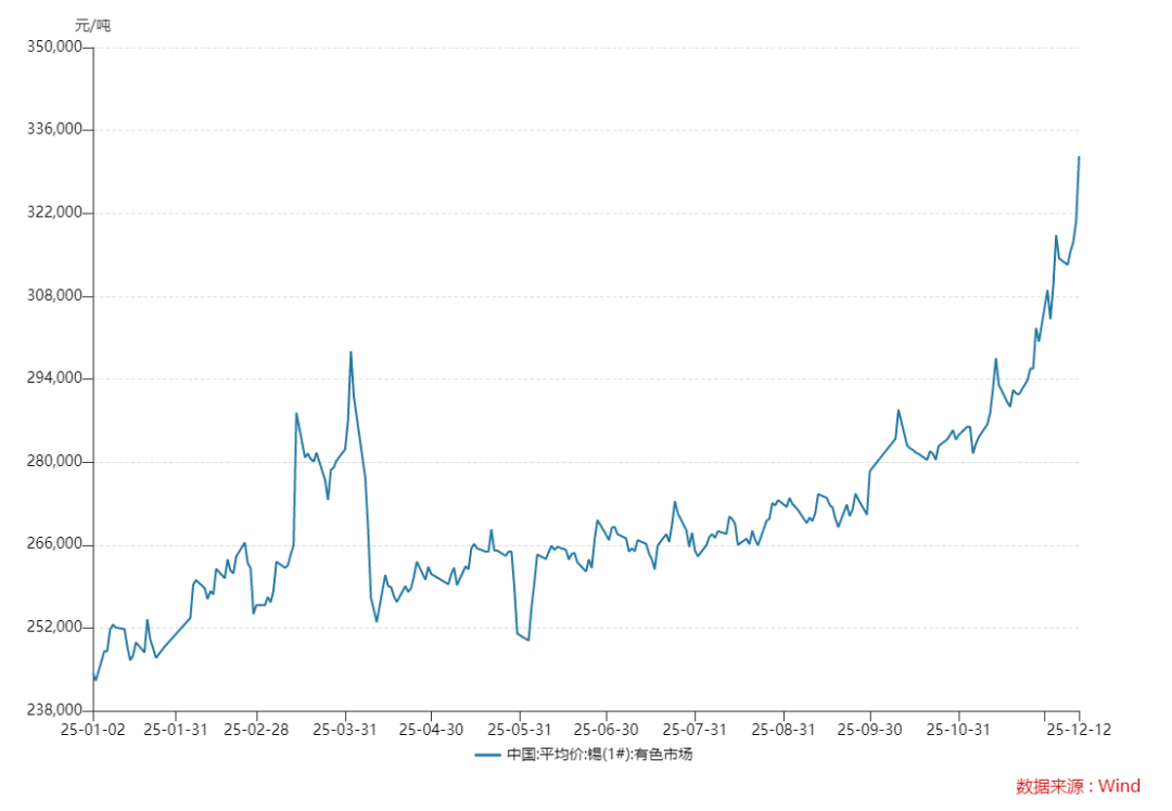 12月12日,國(guó)內(nèi)現(xiàn)貨錫價(jià)在突破每噸33萬(wàn)元整數(shù)關(guān)口后繼續(xù)上行,Wind數(shù)據(jù)顯示,錫(1#)當(dāng)日?qǐng)?bào)價(jià)達(dá)331,640元/噸,單日上漲10,870元,年內(nèi)累計(jì)漲幅約37%,價(jià)格攀升至2022年6月以來的最高位。同期,滬錫期貨主力合約亦大幅收高,市場(chǎng)看漲情緒顯著。